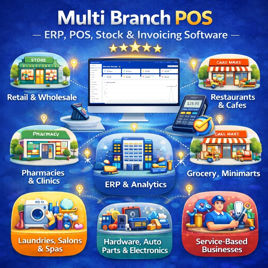 🛒 Grocery Stores, 🧺 Laundries, 📚 Bookshops, 🏪 Retail & Wholesale, 🛠️ Hardware Stores, 💼 Service-Based Businesses, 🛍️ Minimarts, 🌱 Agro & Farm, 🪑 Furniture Stores, 🚗 Auto Parts, 💄 Beauty & Cosmetics, ☕ Cafés & Bakeries, 💻 Electronics, 💊 Pharmacies, 🏥 Medical Clinics, 🍽️ Restaurants, 🔧 Repair Shops, 💆 Salon & Spa, 📱 Mobile Shops, 🏬 Department Stores, ✏️ Stationery, 🏭 Manufacturing, 🎯 Gym & Fitness, 🏨 Hotels.